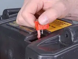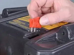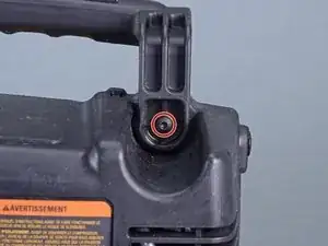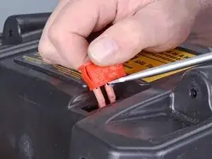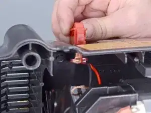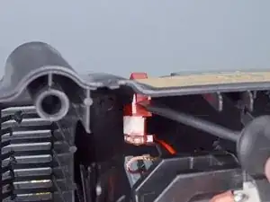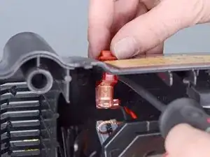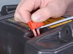 Используйте большую отвёртку с плоским жалом, чтобы нажать на пластиковый фиксатор красной кнопки включения, расположенный ближе всего к открытой стороне корпуса.