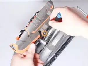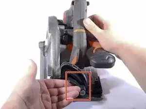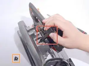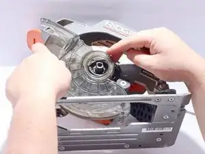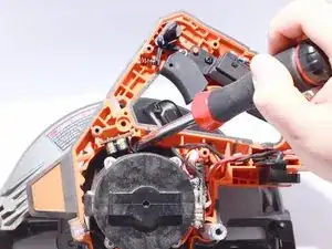 Оттяните нижнюю крышку от металлического кожуха диска, чтобы получить доступ к последнему защитному винту Torx T10 в корпусе двигателя. Он находится рядом с шестигранным стержнем в задней части рукоятки.