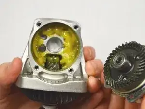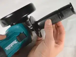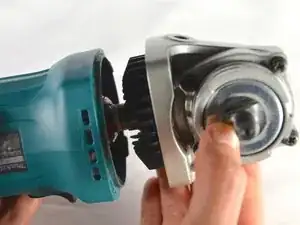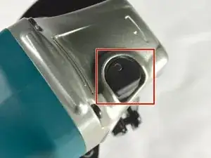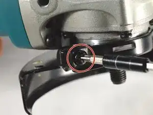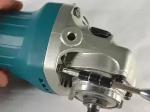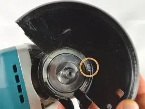 Не отпуская выключатель, воспользуйтесь ключом для гайки, чтобы ослабить серебристый диск, удерживающий все детали на месте.
