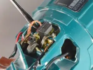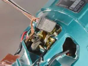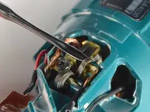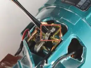 Используя металлическую лопатку, извлеките обе угольные щётки (по одной с каждой стороны) за медные провода.