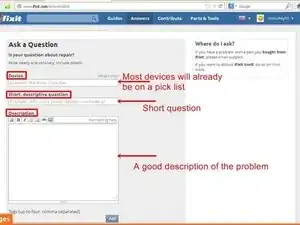 Это действие откроет окно создания вопроса. Здесь вводится устройство, к которому относится вопрос, краткий заголовок и описание проблемы.