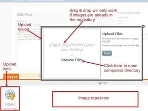 Чтобы открыть диалоговое окно импорта изображения, нажмите на "Значок загрузки"; это откроет окно диалога загрузки. Здесь изображения могут быть либо помещены в вопрос методом "перетаскивания", только если они уже находятся в репозитории изображений. Чаще всего потребуется использовать значок "Просмотреть файлы".