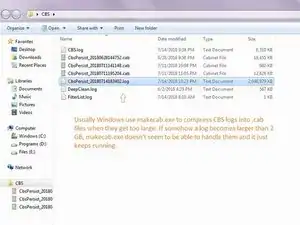 Найдите папку с лог-файлами CBS. Папка обычно содержит .log файл объемом менее 2 ГБ и несколько .cab файлов.