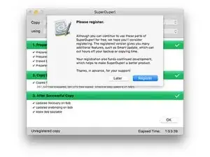 При запросе регистрации SuperDuper! выберите либо "Register" для покупки программы, либо "Later" для регистрации позже.