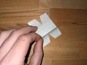 Теперь аккуратно вырежьте небольшой треугольник из пластыря с обеих клеевых сторон, до марлевой прокладки. Вырежьте треугольники точно посередине. Это создаст четыре «маленьких крыла», как видно на втором изображении.