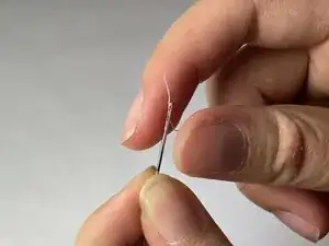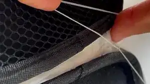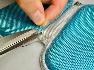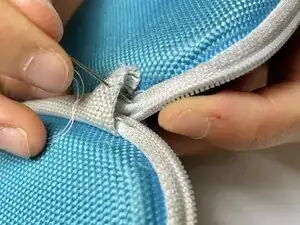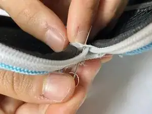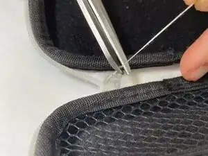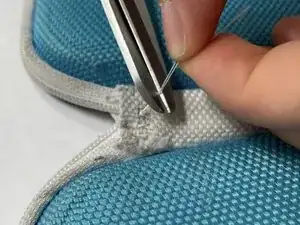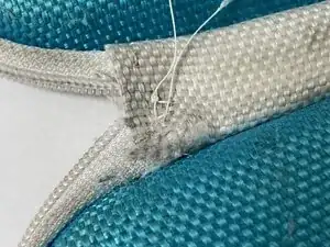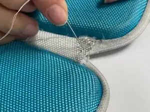 Поскольку изделие Daiso имеет тканевый шарнир, вшитый в жёсткую оболочку чехла, этот ремонт обеспечивает лучший доступ путём крепления трёх слоёв шарнира вместе. Шарнир мягче, поэтому игла проходит через него легко. В результате у вас должен получиться более прочный и долговечный чехол для наушников.