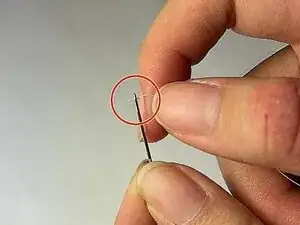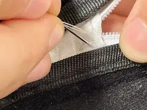 Расположите иглу, чтобы оценить, как она войдёт. Перед введением игла должна находиться на расстоянии примерно 1 см от края повреждённого тканевого шарнира. После введения она должна захватить ткань, идущую параллельно зубцам молнии.