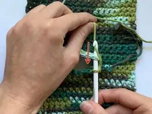 Продолжая первый стежок, оберните пряжу перед крючком и потяните в направлении стрелки через петлю, обёрнутую вокруг крючка.