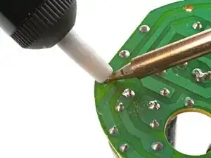 Когда припой расплавится, расположите насадку насоса как можно ближе к расплавленному припою, не касаясь жала.