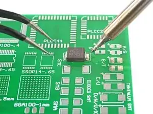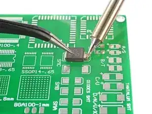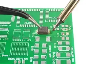 Используйте пинцеты и крючки, чтобы аккуратно разместить компонент так, чтобы он располагался между паяльными площадками.
