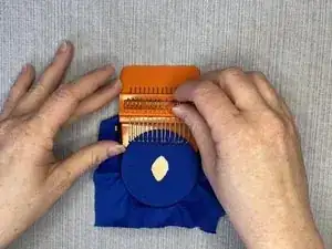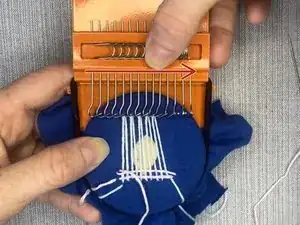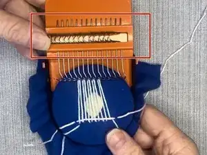 Используя металлические части крючков в верхней части станка, перед началом проталкивания иглы через нити вправо переместите все крючки на правую сторону.