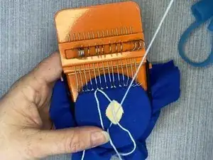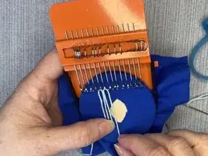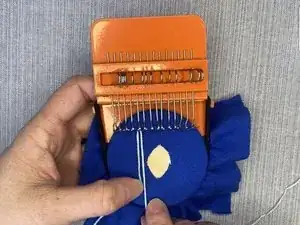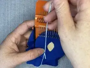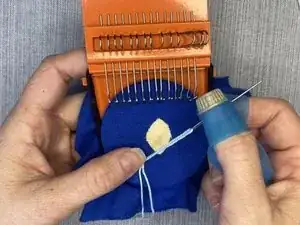 Сделайте стежок прямо слева от последнего стежка нити, свисающей на крючках рамы.