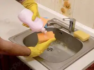 Нанесите жидкое мыло на раковину и вспеньте поверхность с помощью микрофибровой ткани