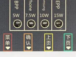 Select: короткое нажатие — переключение тестера в режим обнаружения посторонних предметов (FOD). Это должно быстро отключить площадку беспроводной зарядки. Эта кнопка действует как кнопка «выбрать» в меню.