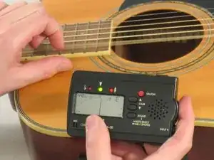 Используйте тюнер для гитары, чтобы проверить настройку струны. Регулируйте до тех пор, пока струна не будет правильно настроена.