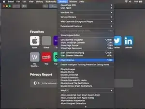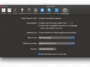 Откройте веб-браузер, разверните выпадающее меню Safari в строке Finder и выберите Настройки. Перейдите на вкладку «Дополнительно» и установите флажок напротив Показать меню «Разработка» в панели меню (если ещё не включено).