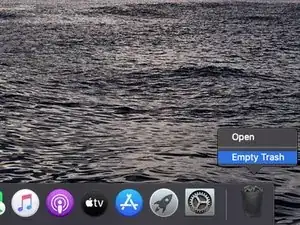 Щёлкните правой кнопкой мыши по иконке Корзины в Dock, выберите Очистить корзину в контекстном меню, затем нажмите кнопку Очистить корзину в диалоговом окне подтверждения действия.