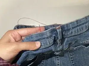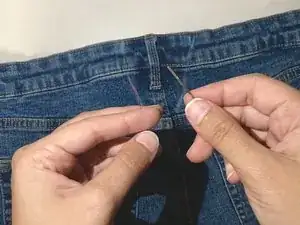 Продолжайте подтягивать нитку, пока она не усядется внутрь ткани брюк и не станет незаметной.