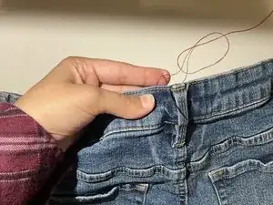 Уберите конец нитки обратно внутрь брюк и завяжите узел на изнанке.
