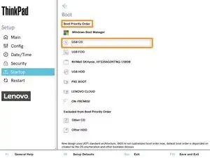 Ищите опцию вроде «Boot order» или «Boot override» и выберите USB‑накопитель. Если его нельзя выбрать, переместите его в начало списка порядка загрузки, затем сохраните изменения и выйдите (Save & Exit).