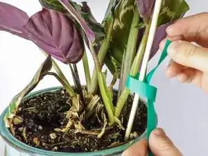 Установите опорную палочку прочно в почву рядом со сломанным стеблем.