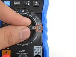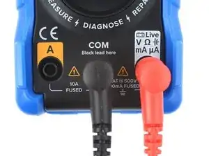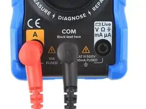 Подключите чёрный щуп к разъёму COM. Подключите красный щуп к разъёму A (левый разъём на мультиметре iFixit).