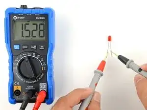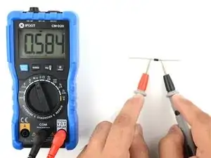 В следующих двух шагах показано, как безопасно измерить большие электролитические конденсаторы. Эти конденсаторы выглядят как маленькие цилиндры. Мультиметр iFixit способен измерять ёмкость до ~100 мФ (миллифарад).