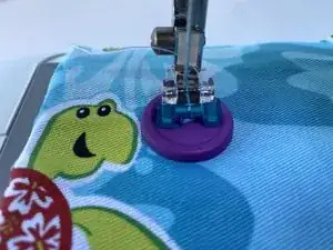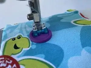 Поместите кнопку под лапку и вручную опустите иглу, чтобы убедиться, что она выровнена с первым отверстием справа.