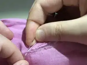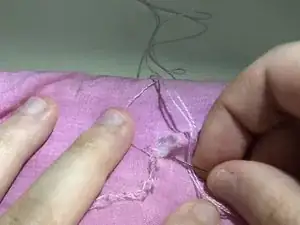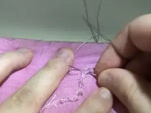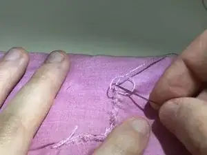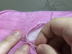 Последнюю нитку, которую вы вытягиваете, не тяните полностью, а вместо этого пропустите иглу через образовавшуюся петлю и создайте надежный узел. Повторите этот шаг еще 2-3 раза, threading through the same hole, чтобы создать дополнительный надежный узел.