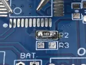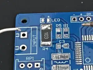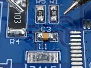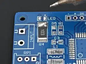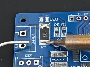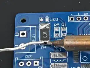 Приложите жало паяльника к одной из контактных площадок в контуре, обозначенном как R4, на несколько секунд, чтобы её нагреть.