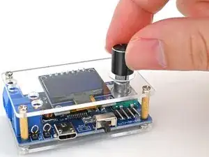 Выровняйте ручку энкодера по контуру, отмеченному EC11 на лицевой стороне платы. Ориентируйте её так, чтобы три контакта вверху соответствовали трём отверстиям на плате под надписью MiNi-DSO.