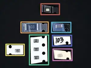 Каждый резистор и конденсатор (кроме трёх резисторов 2 кΩ) уникален и должен быть установлен в своё место на плате. Конденсаторы 10 μF и 22 nF выглядят одинаково, за исключением маркировки на упаковке 103. Используйте пинцет, чтобы снять упаковку с каждого компонента перед пайкой.