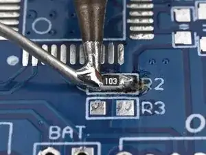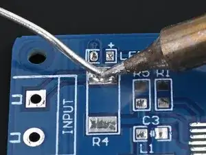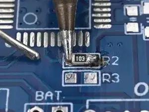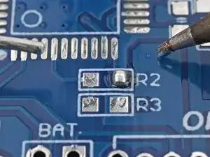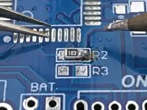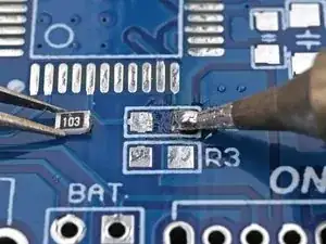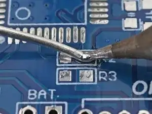 Прижмите жало паяльника к одной из паяльных площадок R2 на плате на несколько секунд, чтобы её разогреть.
