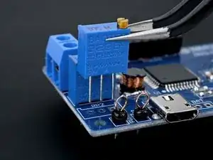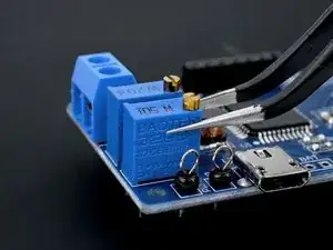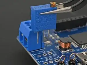 Выровняйте второй подстроечный резистор (с маркировкой W501 сверху) по контуру, обозначенному RP2 на лицевой стороне платы. Золотистая ручка должна быть ближе всего к микроконтроллеру.