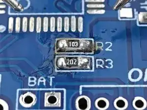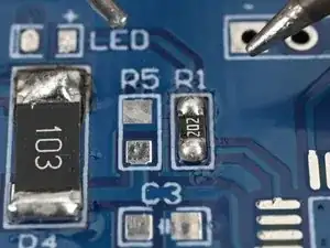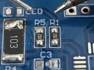 Повторите этот процесс, чтобы припаять три резистора 2 kΩ (маркировка 202) в контурах с обозначениями R3, R1 и R5 на лицевой стороне платы.