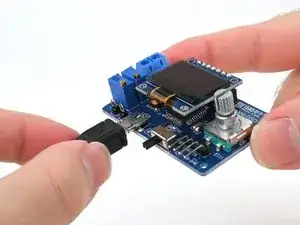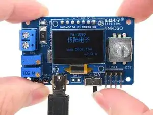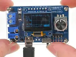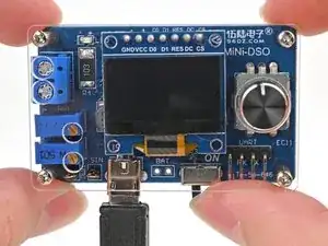 Если тумблер выключен, переведите его в положение ON, чтобы включить осциллограф. Вы должны увидеть, как на дисплее появится надпись "MiniDSO" вверху.