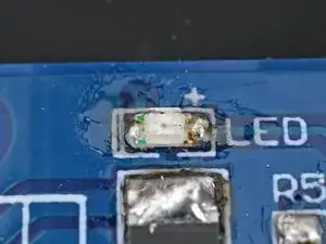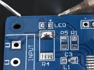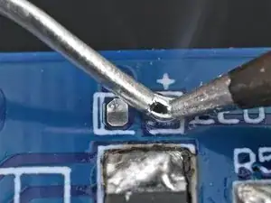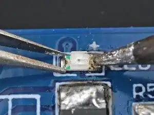 Прижмите жало паяльника к паяльной площадке LED на плате на несколько секунд, затем поднесите припой к разогретой области, пока на площадке не образуется небольшая капля припоя.