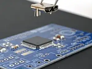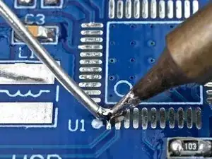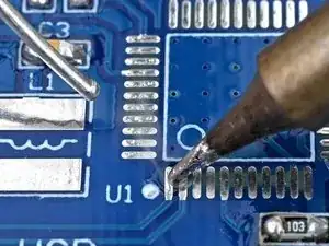 Прижмите жало паяльника к нижней левой паяльной площадке микроконтроллера на плате на несколько секунд, чтобы её разогреть.
