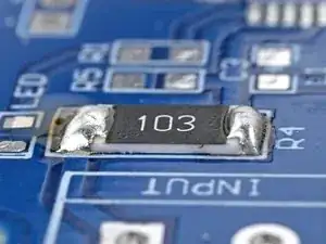 На этом шаге вы подготовите одну из контактных площадок резистора, нанеся на неё припой. Это упростит пайку резистора.