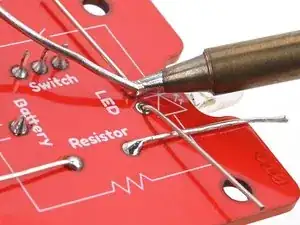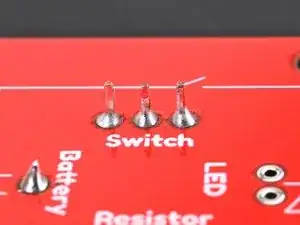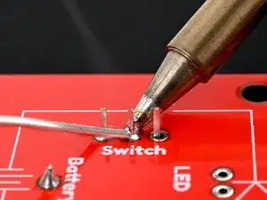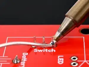 Убедитесь, что переключатель остаётся прижатым к плате и что выводы остаются на одном уровне друг с другом во время пайки. Если он сдвинется, отпаять выводы и попробовать снова.