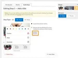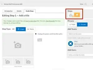 Чтобы добавить новый шаг, выберите белый знак плюс в жёлтом квадратике в правом верхнем углу экрана. Затем добавьте текст к новому шагу. Повторяйте для каждого шага руководства.