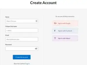 Сначала — создайте учётную запись. Перейдите на iFixit.com, затем нажмите Join в правом верхнем углу главной страницы. Далее заполните поля с Вашими данными и нажмите большую синюю кнопку Create My Account, чтобы завершить.