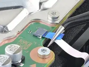 Иногда просто удалить разъём из гнезда недостаточно — требуется ещё один-два шага, чтобы освободить кабель. Здесь у нас плоский кабель, слегка приклеенный на место.