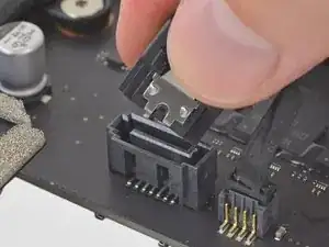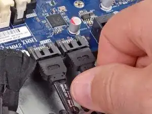 Некоторые варианты SATA-кабеля имеют небольшой металлический фиксирующий язычок на боковой стороне, который может потребоваться нажать перед тем, как тянуть.