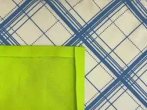 В показанном ремонте у ткани заплаты диагональный рисунок относительно направления нитей.