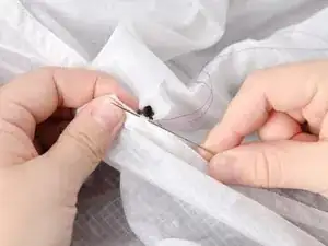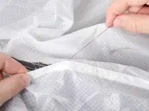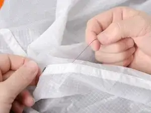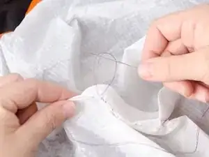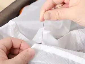 Мы используем контрастную нитку для лучшей видимости, но при ремонте вам нужно будет использовать нитку в тон.
