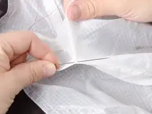 Проденьте иглу с задней стороны материала, чуть перед началом разрыва.