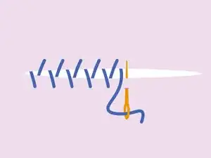 Сначала введите иглу в разрыв рядом с исходным стежком, затем выведите её через изнанку ткани на противоположной стороне разрыва! Шейте назад вдоль разрыва в обратном направлении, размещая каждый новый стежок между исходными.