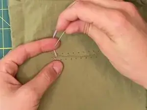 С изнаночной стороны ткани протолкните иглу прямо у одного из отмеченных пунктов прокола на одном из концов.