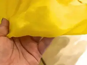 Для следующей стороны (красная стрелка) подогните её внутрь, чтобы она совпала по длине с ранее закрепленной тканью (оранжевая стрелка).